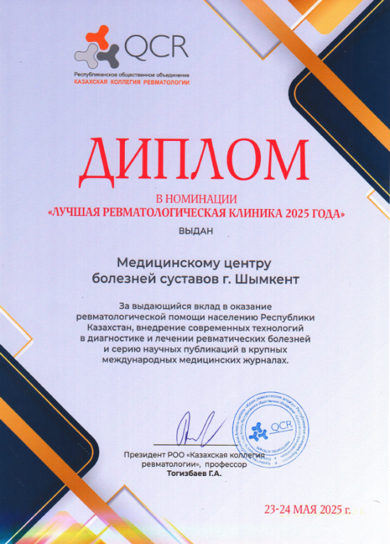 Медицинский центр болезней суставов получил диплом в номинации "Лучшая ревматологическая клиника 2025 года"
